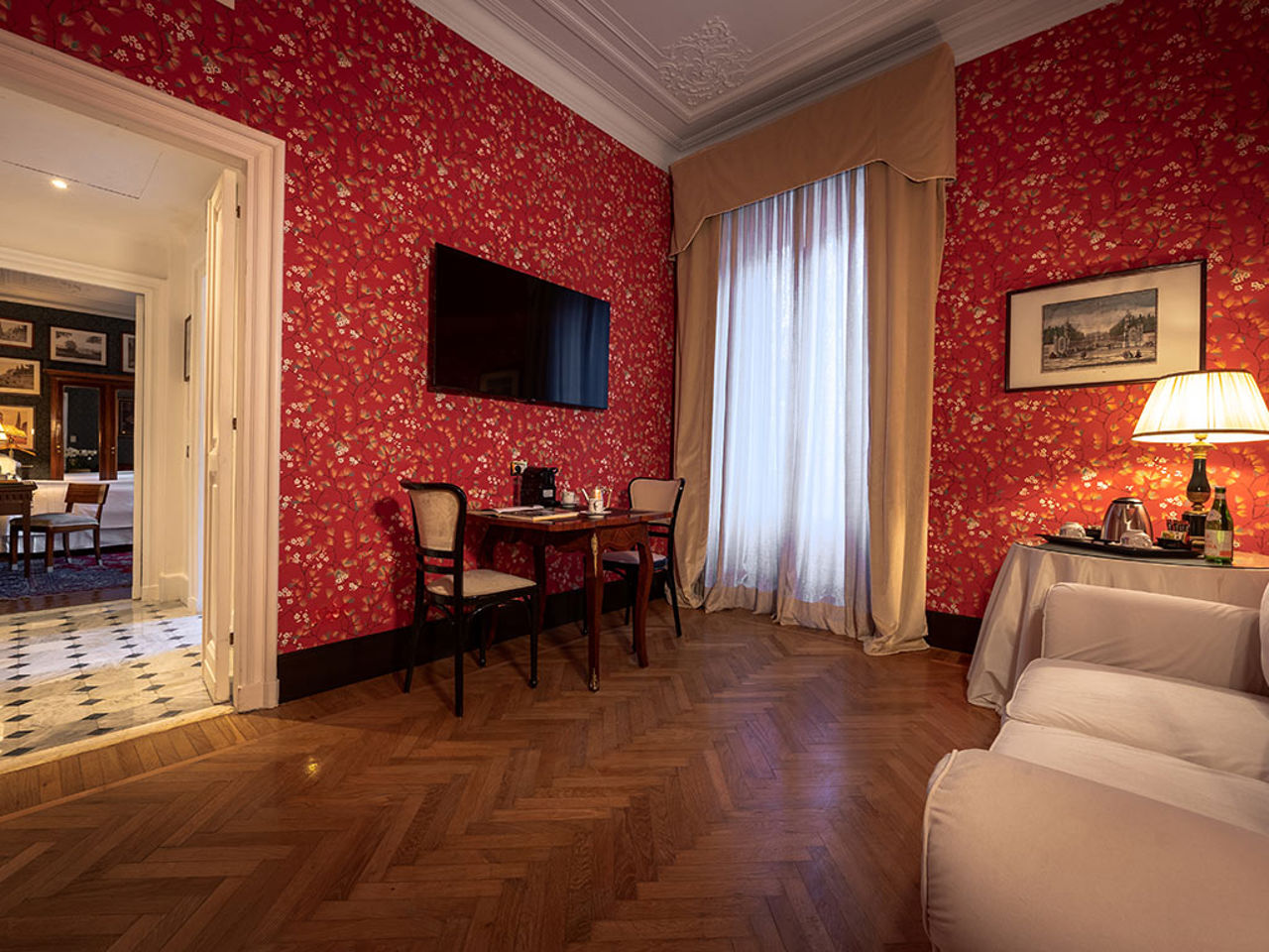 Le Junior Suite del nostro hotel di lusso vantano un affaccio sull’incantevole giardino interno, la sera si possono ammirare le vetrate liberty che prendono luce dallo scalone monumentale interno. Alcune Junior Suite dispongono di un patio interno esclusivo, immerso nel verde del giardino per un angolo di quiete e riservatezza.