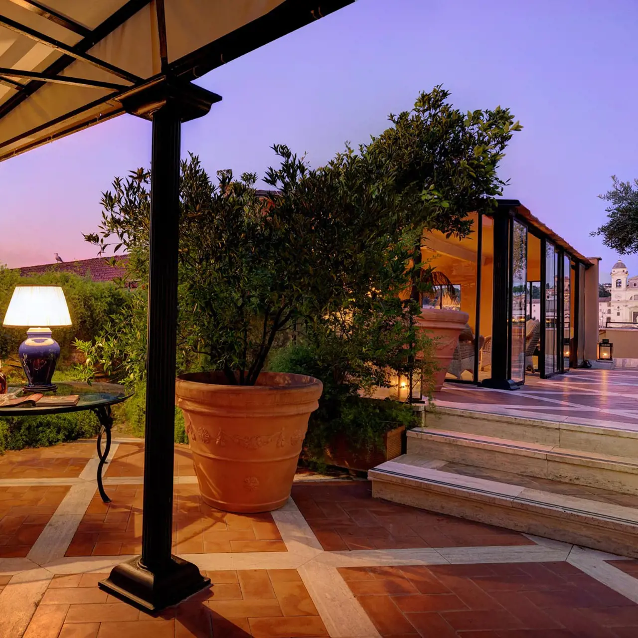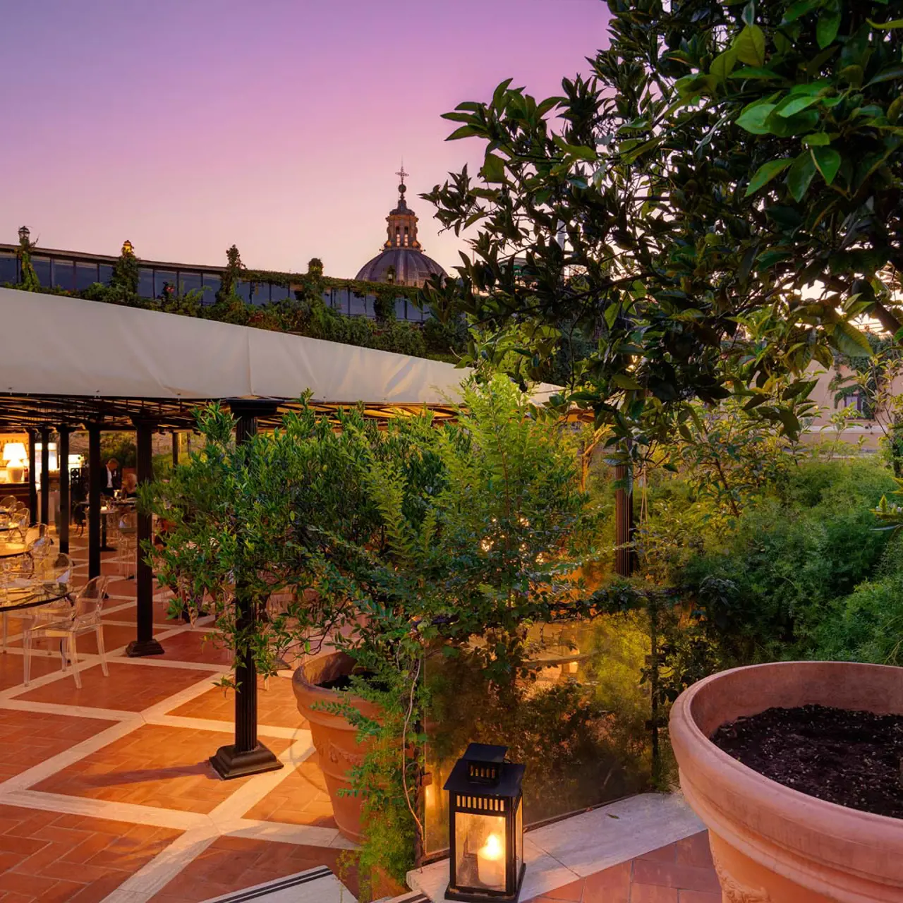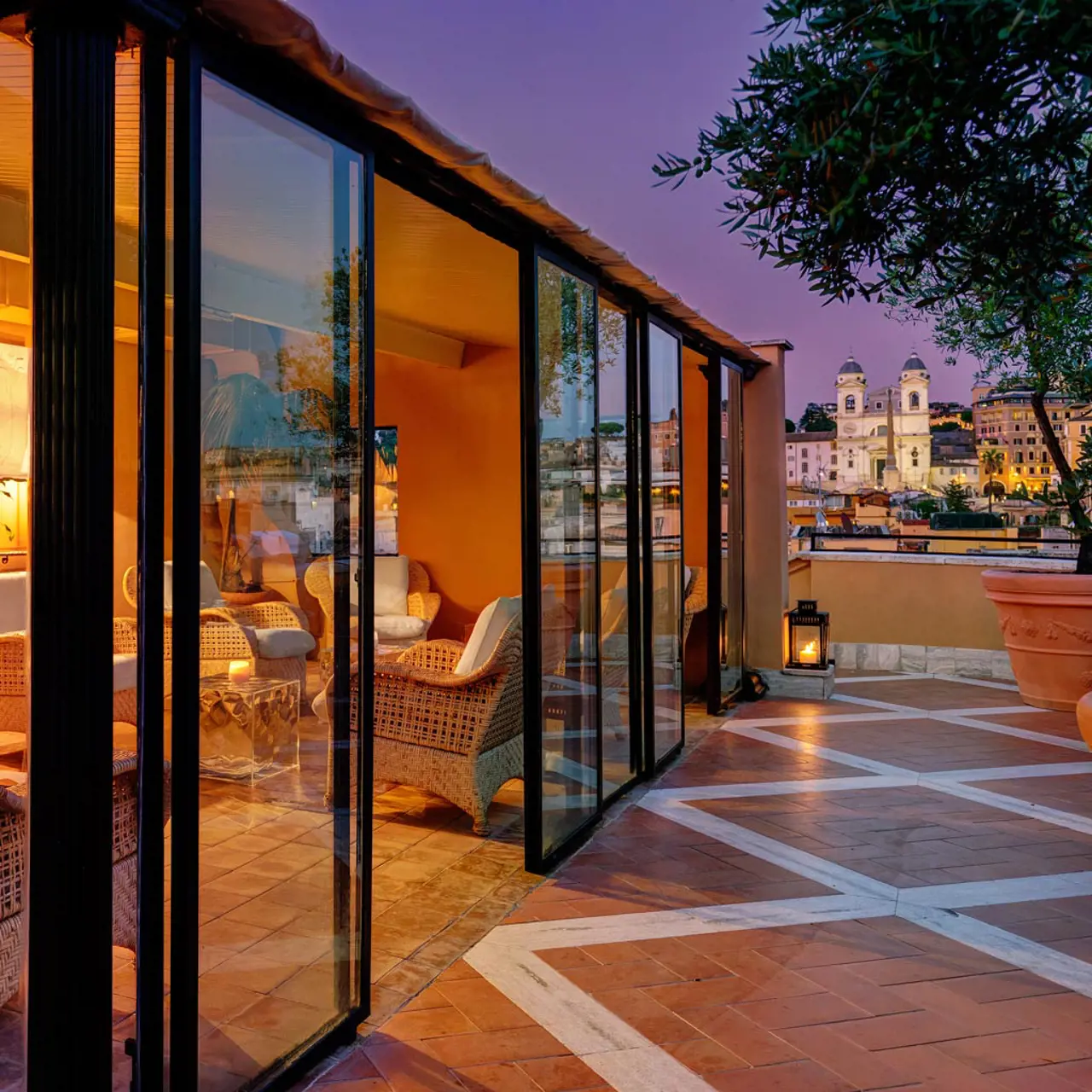 Ubicata al quinto piano del Grand Hotel Plaza, la Terrazza Trinità dei Monti è un esclusivo rifugio di relax per i clienti dell'albergo e il luogo ideale per ospitare eventi privati. Questo spazio offre un ambiente intimo e ricercato, perfetto per chi cerca un'opportunità di rilassarsi in un ambiente raffinato, immerso nel fascino della città eterna.