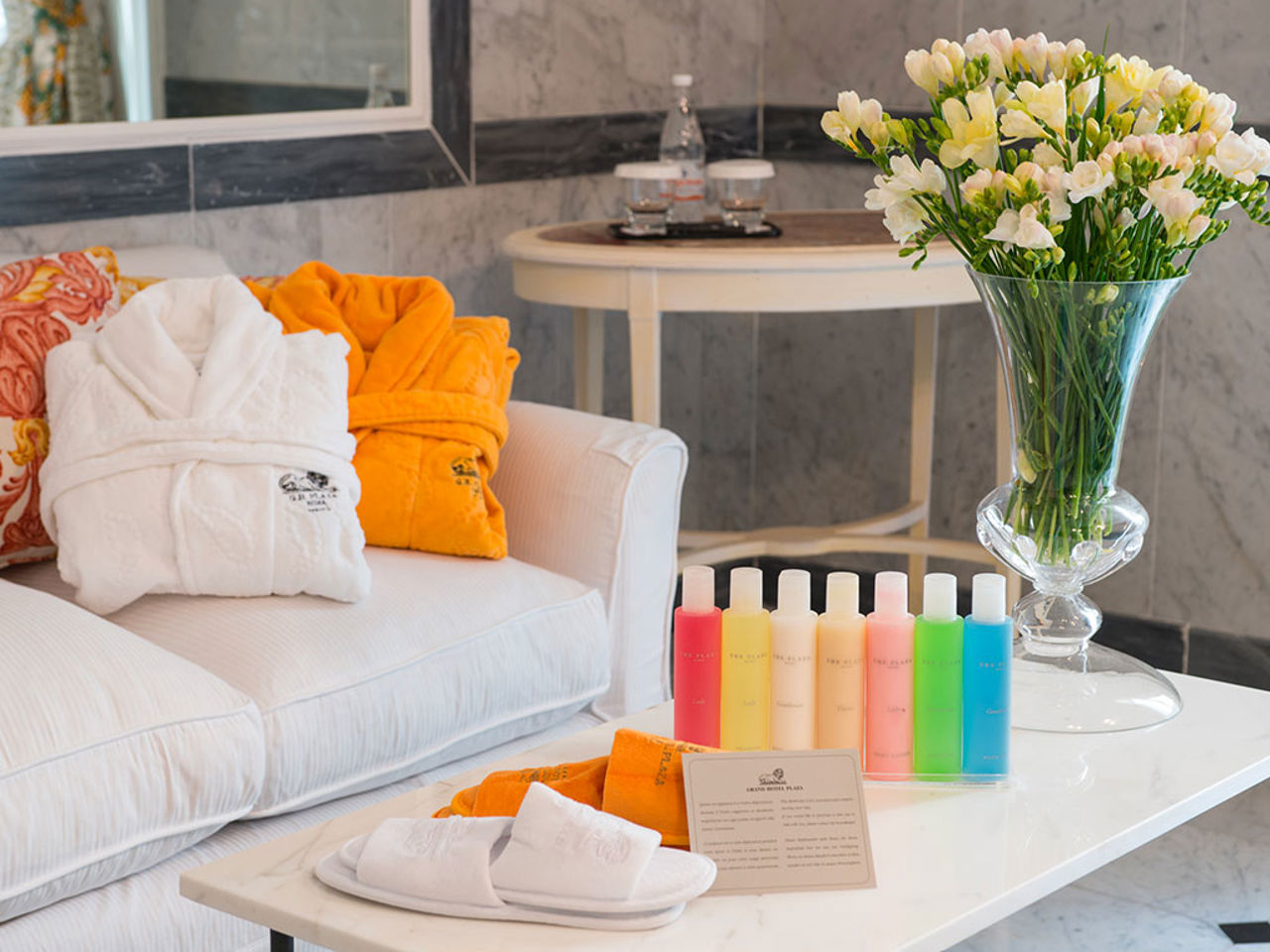 Most of the bathrooms, clad in Italian Carrara marble, include both a large shower and a separate bathtub. Guests can enjoy a range of personal care products by Sorelle Fontana and bathrobes by the well-known brand Etro.