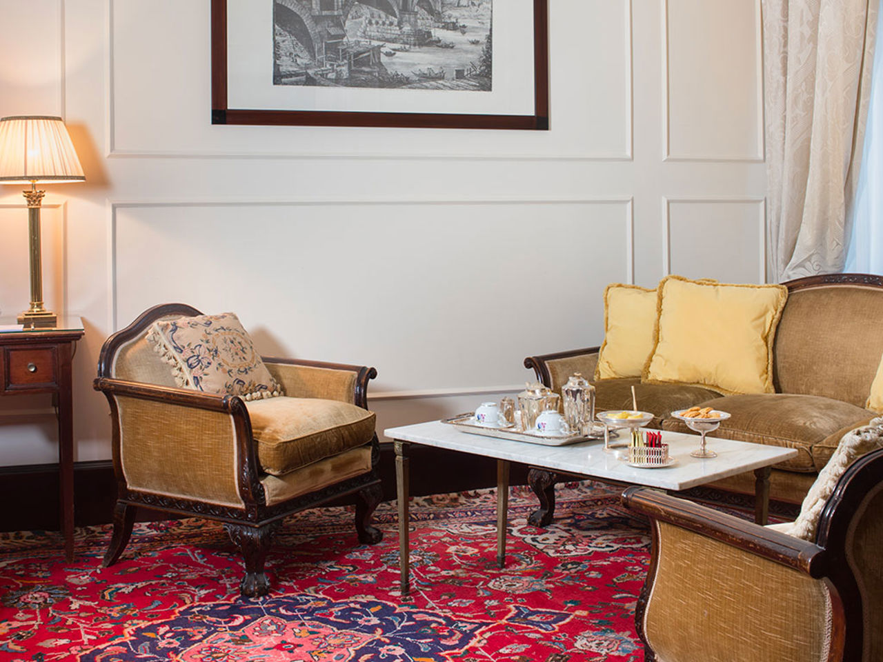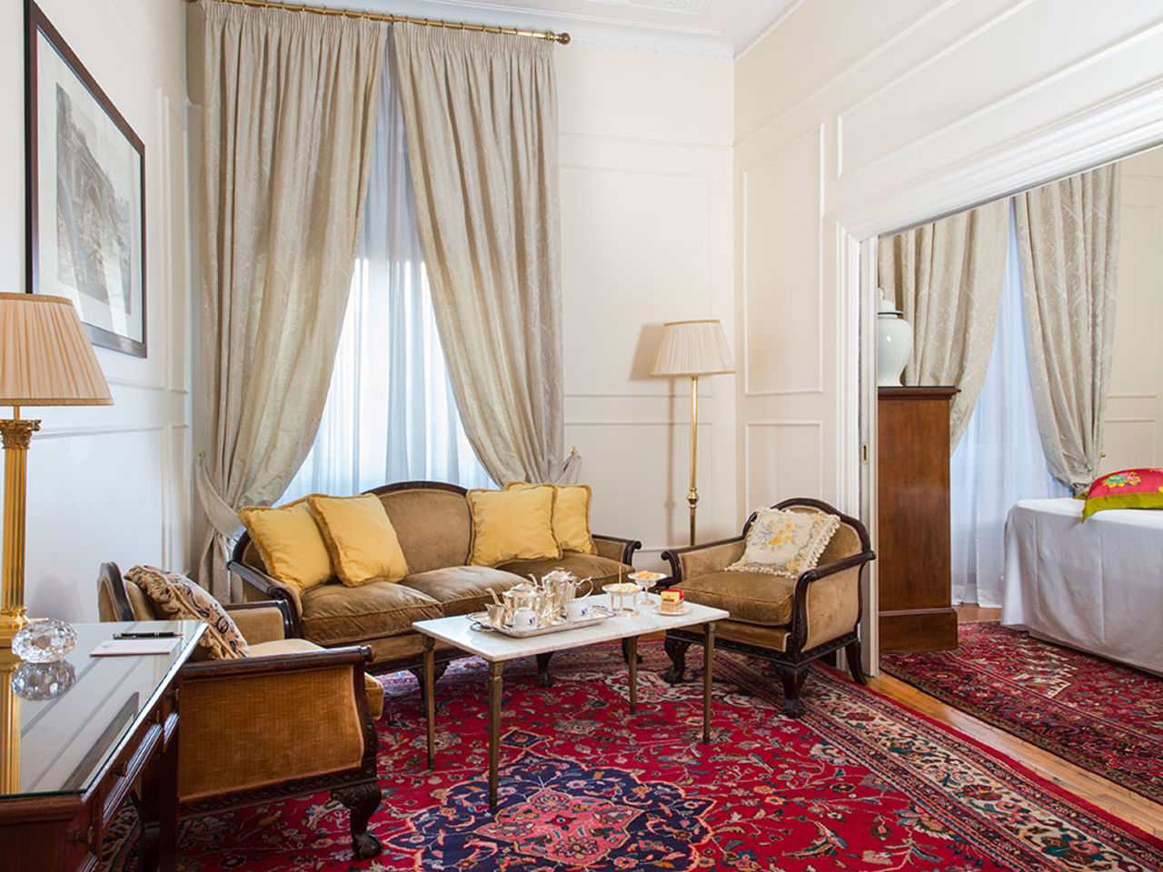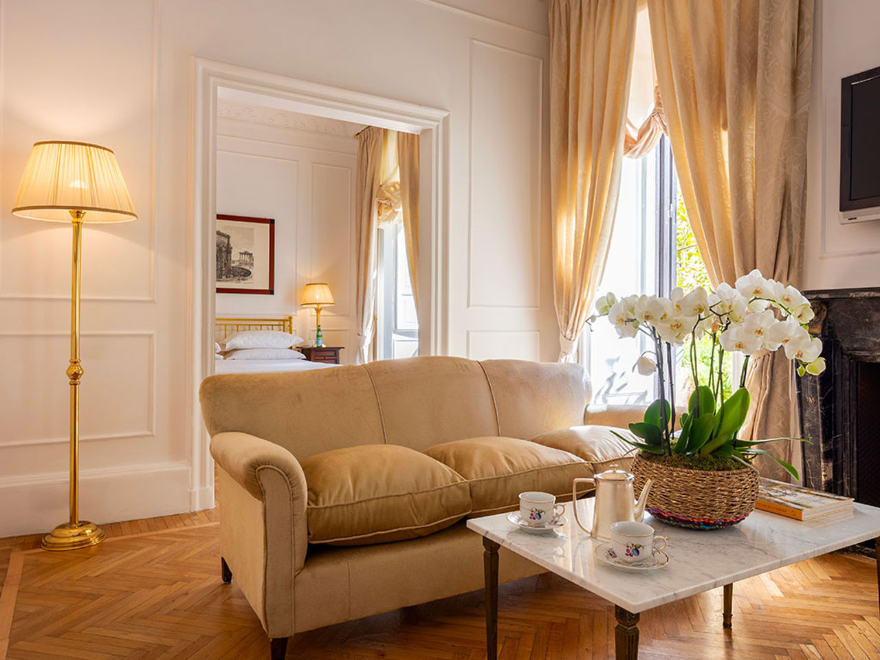 The Junior Suites at our luxury hotel boast a view of the enchanting indoor garden, and in the evening you can admire the Art Nouveau windows that catch the light from the monumental staircase inside. Some Junior Suites have an exclusive indoor patio, tucked away in the greenery of the garden for a corner of peace and privacy.